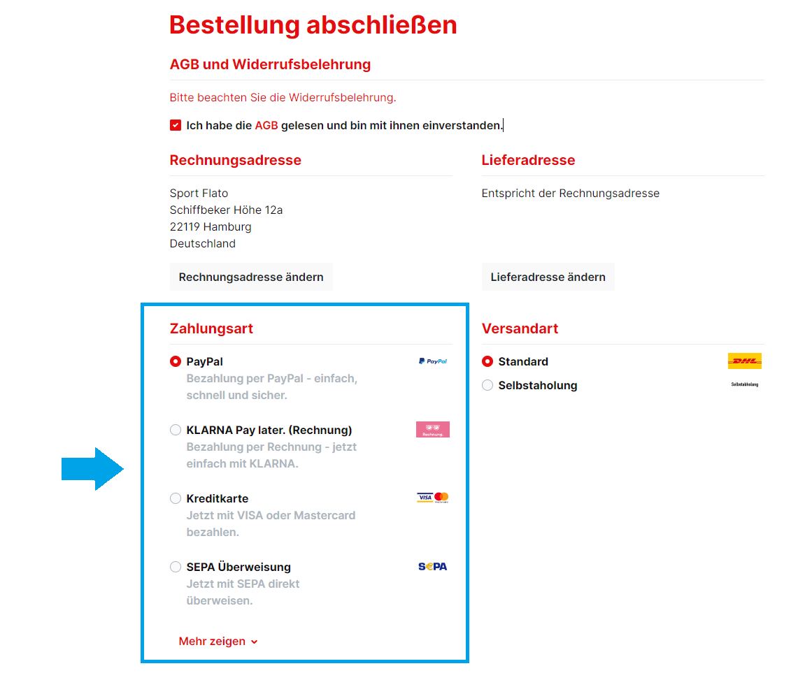 Jetzt kannst du die Zahlungsmethode auswählen (siehe Bild). Wenn du das gemacht hast kannst du "Zahlungspflicht bestellen". Je nach ausgewählter Zahlungsmethode öffnet sich ein neues Fenster des jeweiligen Zahlungsdienstleister (bspw. PayPal). Dort befolgst du alle weiteren Schritte, wie bspw. das Anmelden in deinem PayPal Account. Wenn du das erfolgreich gemacht hast, wirst du automatisch zurück zu Sport Flato geleitet und du bekommst eine Bestellbestätigung und je nach Zahlungsmethode auch eine Zahlungsbestätigung per Mail.