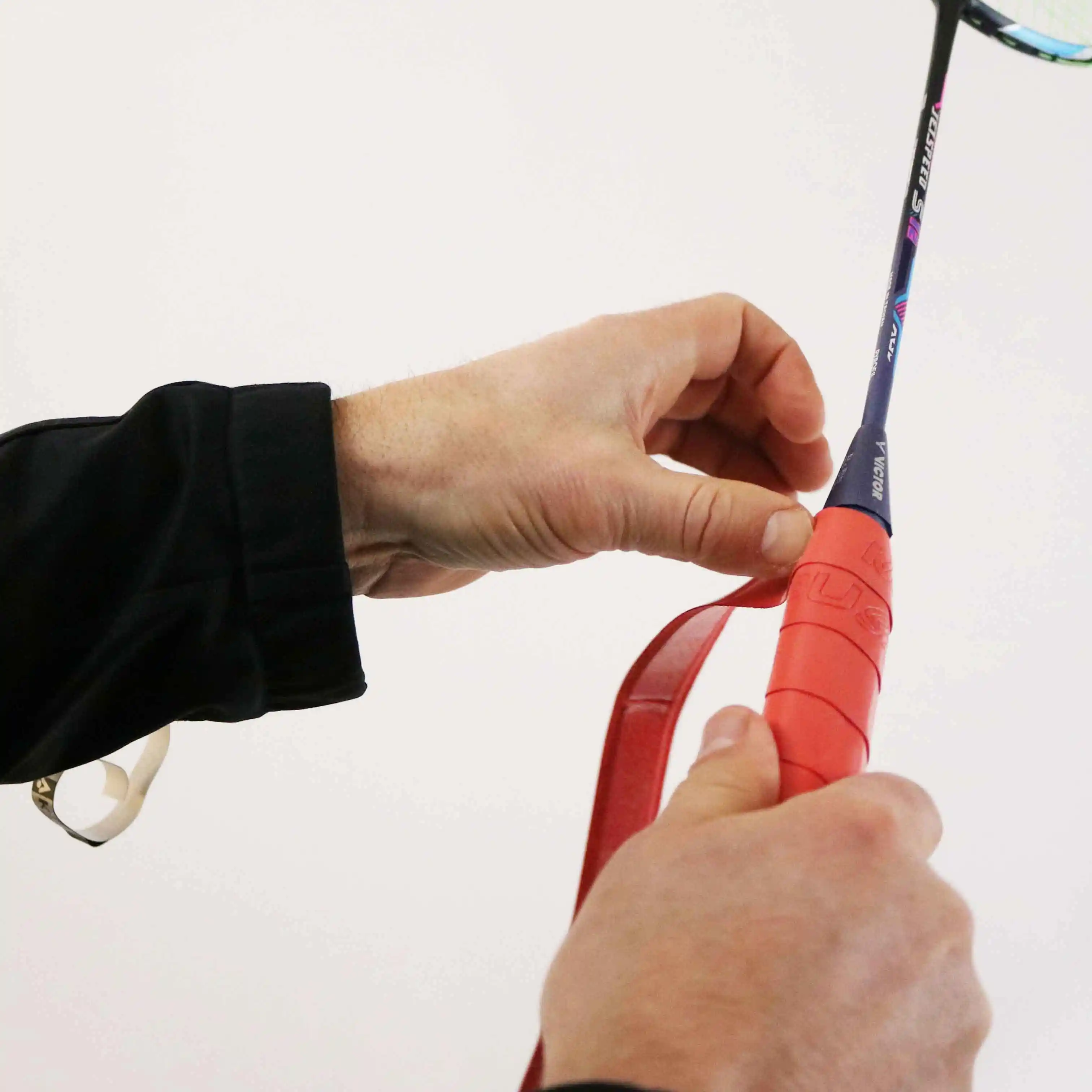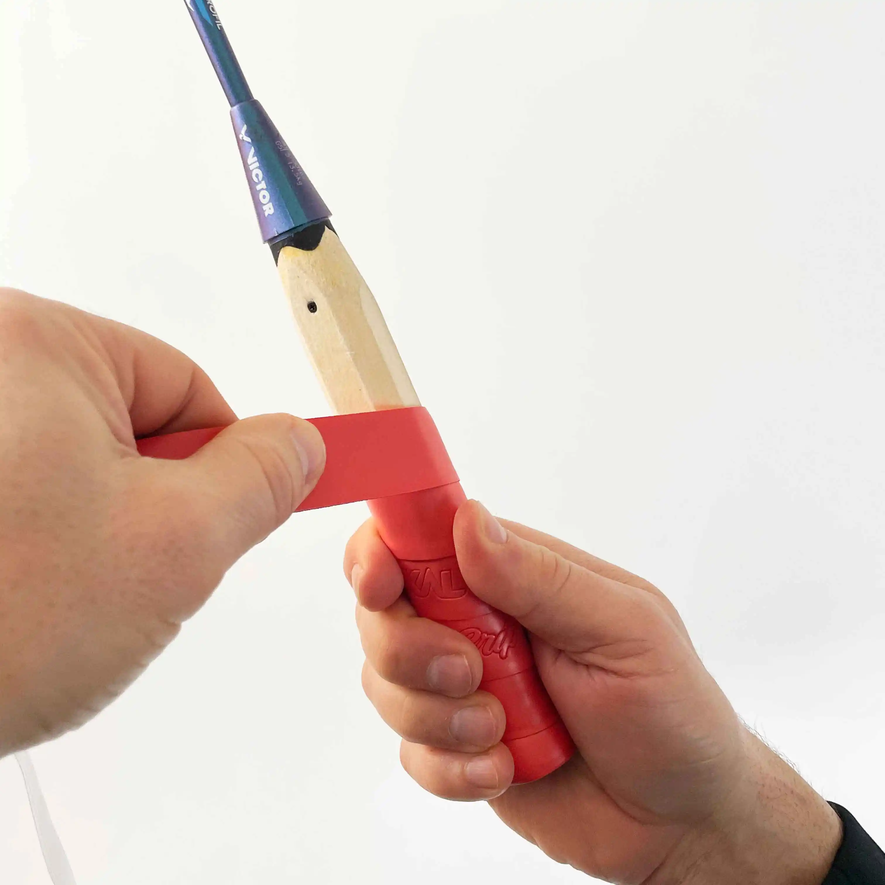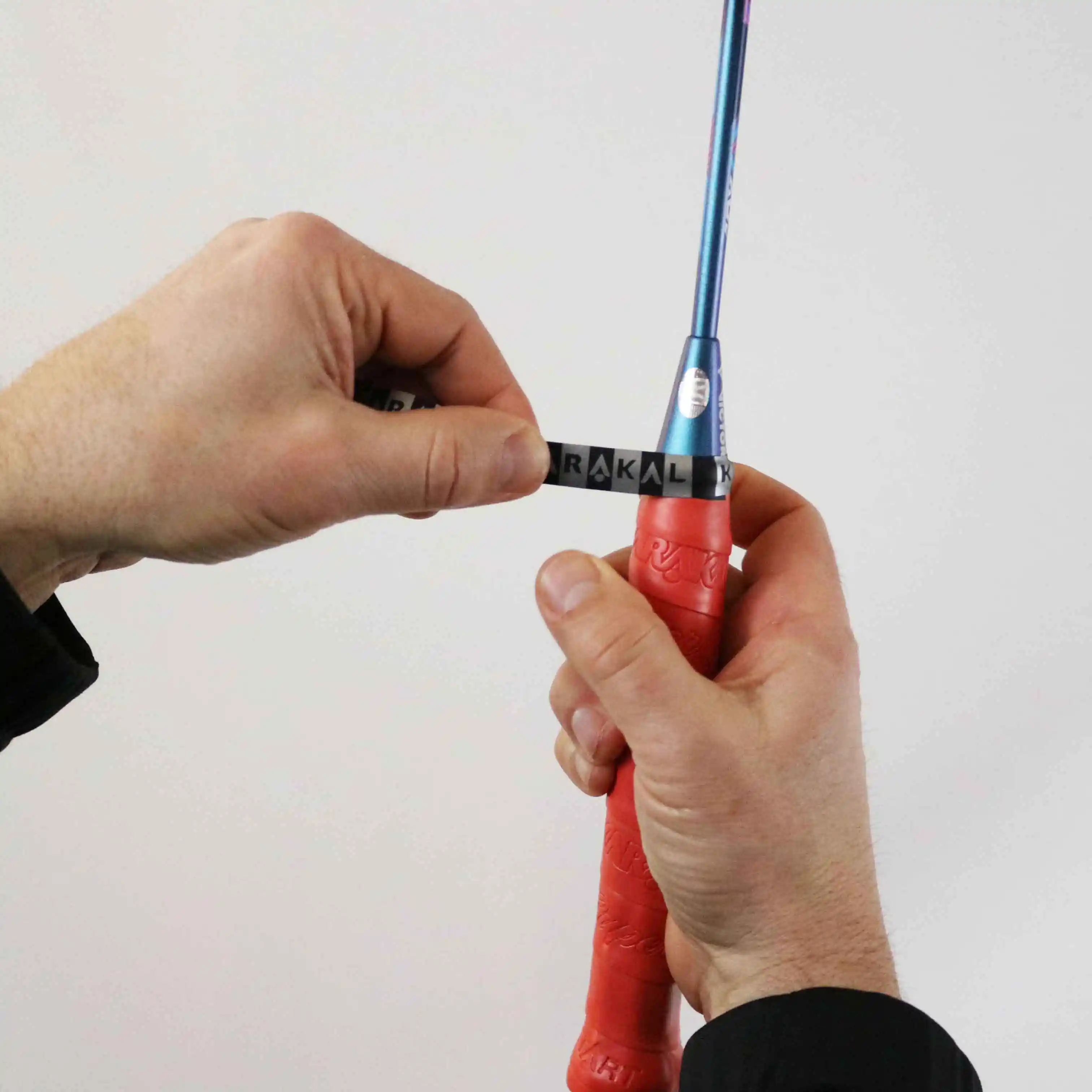 - Das Griffband auf den Schaft wickeln: Wickelst du das Griffband so hoch, veränderst du die Eigenschaften deines Badmintonschlägers. Du nimmst Flexibilität aus deinem Schaft und veränderst den Balancepunkt deines Badmintonschlägers.