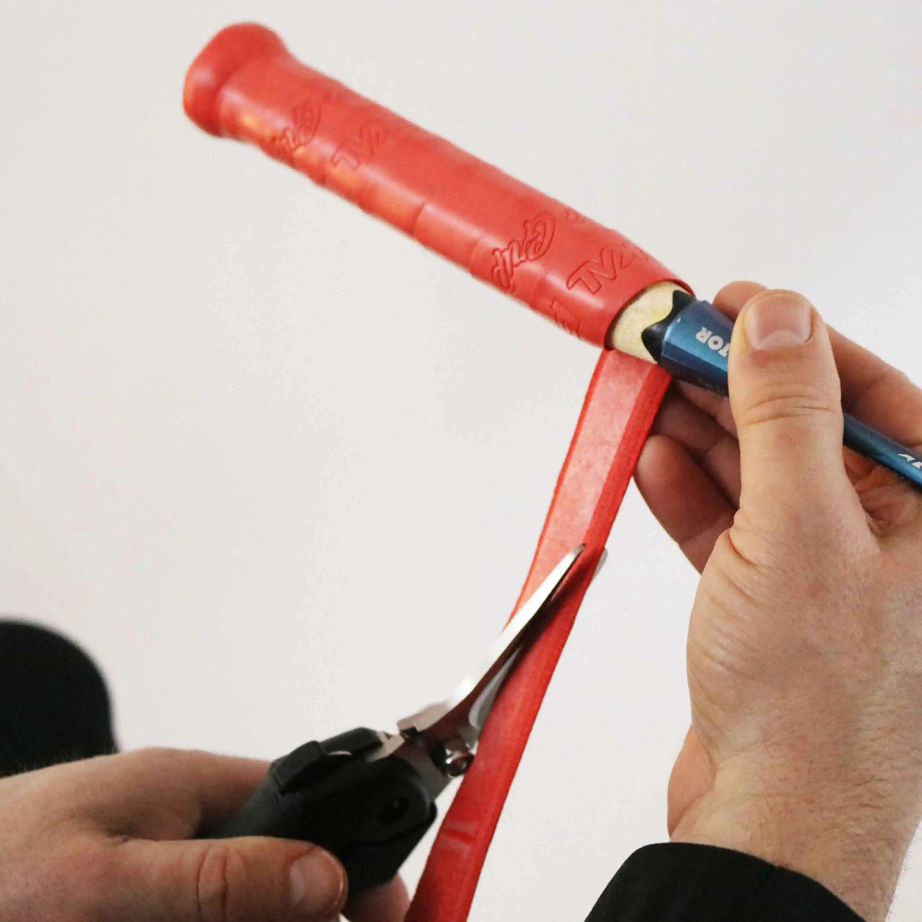 Oben angekommen musst du jetzt nur noch den Rest deines Griffbandes abschneiden. Ziehe dazu das Griffband richtig straff und setze es leicht unter Spannung, damit du besser und sauberer zuschneiden kannst.